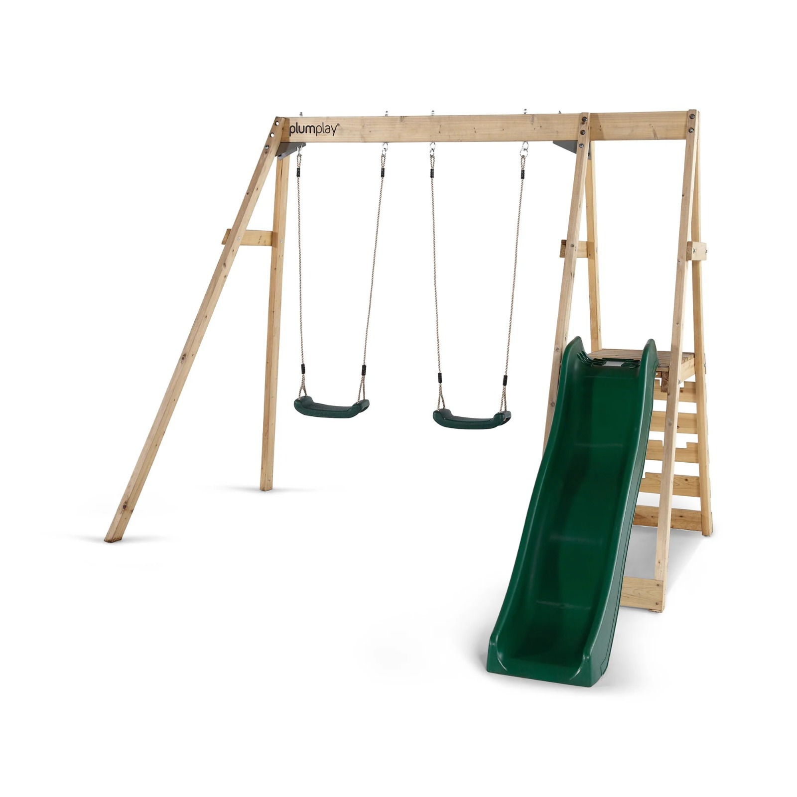 - Play set includes double swing arm and wooden ladder to a wooden play deck with 1.78m wave slide